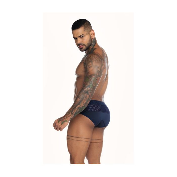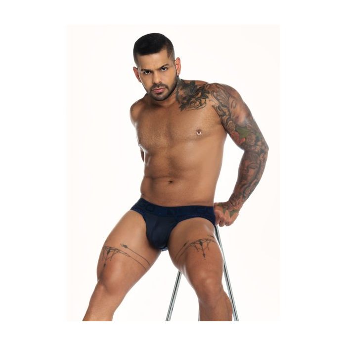 De slip heeft een brede tailleband van elastisch materiaal. In de tailleband is het GIGO logo geborduurd en de tailleband zit laag om de heupen voor een sexy look. De buidel heeft een comfortabele pasvormen is gemaakt van ondoorzichtige stof. Over de heupen loopt mesh door naar de achterkant vaan een spannend inkijkje in de slip.