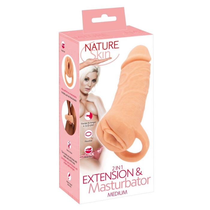 De 2in1 Extension + Masturbator MEDIUM van Nature Skin is een uniek speeltje dat zorgt voor een echt voelende handjob en vullend seksplezier. Dit speeltje combineert een penis sleeve voor verlenging en verdikking met een masturbator, waardoor het perfect is voor solo-avonturen of gedeeld plezier. Aan de buitenkant heeft het een opwindend realistisch design met een opening die eruitziet als een vagina en een sleeve die eruitziet als een geaderde penis met een mollige eikel.
