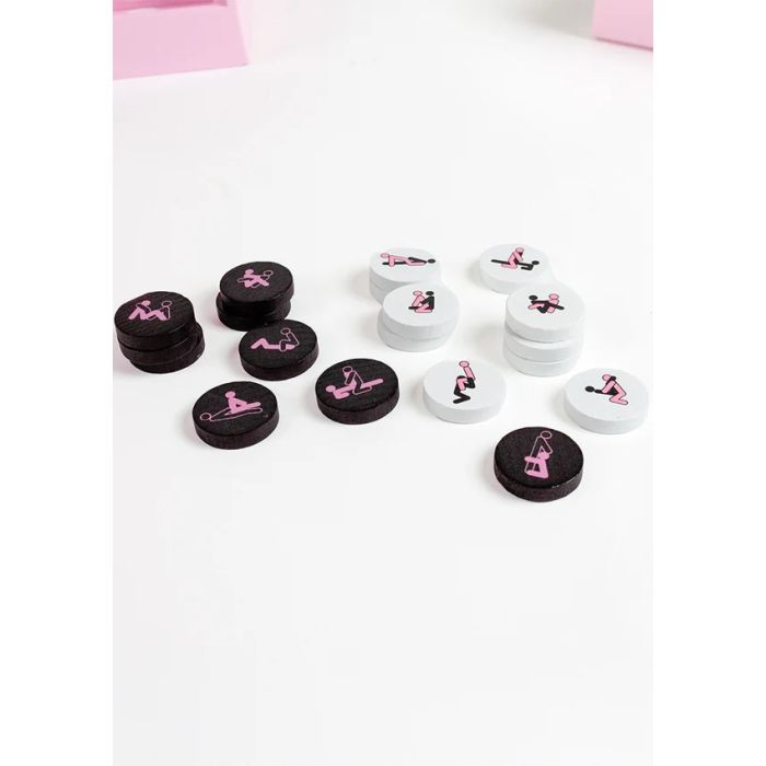 Dit spel daagt je uit om vier fiches van dezelfde kleur op een rij te leggen, terwijl je tegelijkertijd je partner probeert te blokkeren. Met 42 fiches in totaal, waaronder 21 witte en 21 zwarte, is elke fiche versierd met een andere Kamasutra-positie die je fantasie prikkelt. Het afneembare spelbord maakt het eenvoudig om het spel op te zetten en op te bergen, zodat je het altijd bij de hand hebt voor een speelse avond.