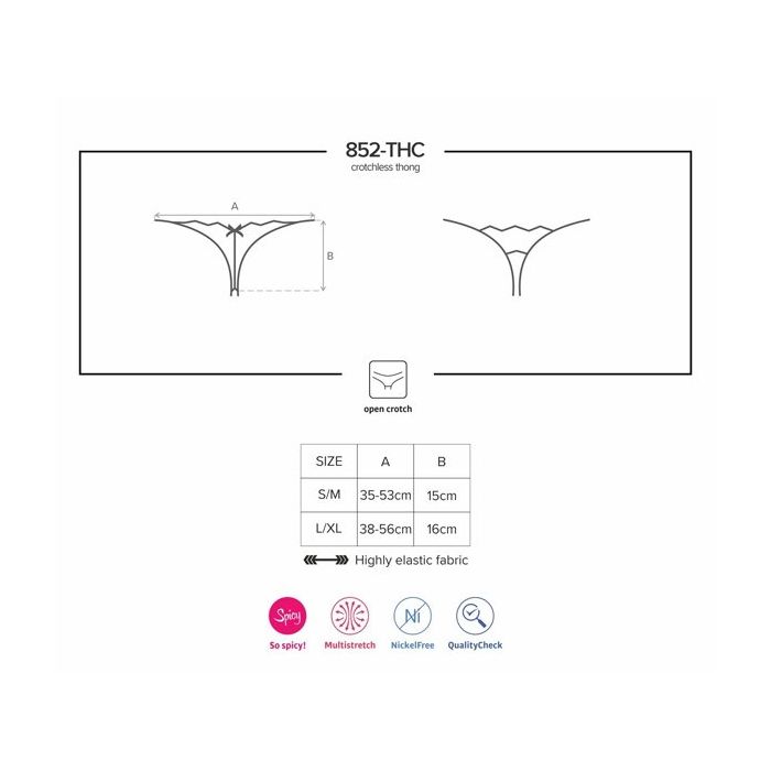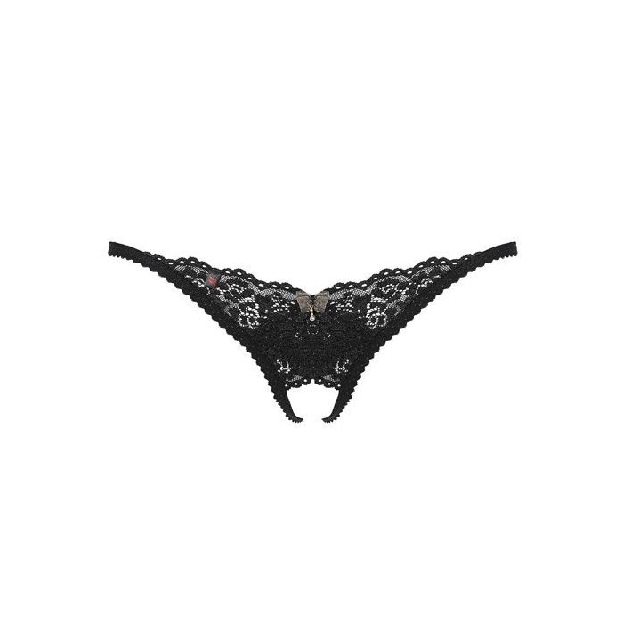 Haal de 852 Kruisloze Kanten String - Zwart van Obsessive in huis en je kunt je voorbereiden op spannende ongeplande vluggertjes. Dit speelse stringetje heeft een romantisch design door het geschulpte bloemen kant en het strikje en bedeltje, maar ondertussen is dit een een string waarin jij je heerlijk ondeugend en sexy kunt voelen. Het open kruis maakt het mogelijk om over even snel van elkaar te genieten, maar ook wanneer je de tijd voor elkaar wilt nemen is dit zeker een verleidelijke aanrader.