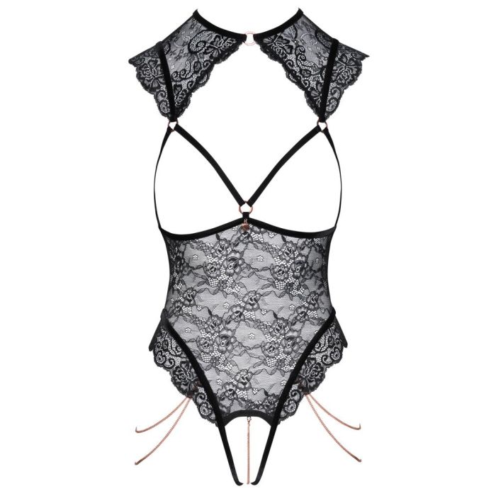 De zwarte open body van Abierta Fina belichaamt sensuele verfijning en is vervaardigd uit een zacht stretch bloemenkant dat perfect aansluit op de huid. Dit luxe materiaal biedt niet alleen een comfortabele pasvorm, maar accentueert ook de vrouwelijke vormen op een elegante manier. De combinatie van elastische fluwelen linten en roségoudkleurige accessoires voegt een opzichtige uitstraling toe, waardoor dit kledingstuk ideaal is voor speciale gelegenheden of intieme momenten. De busteloze constructie, samen met het schouderbedekkende kant, zorgt voor een verleidelijk en toch verfijnd silhouet.