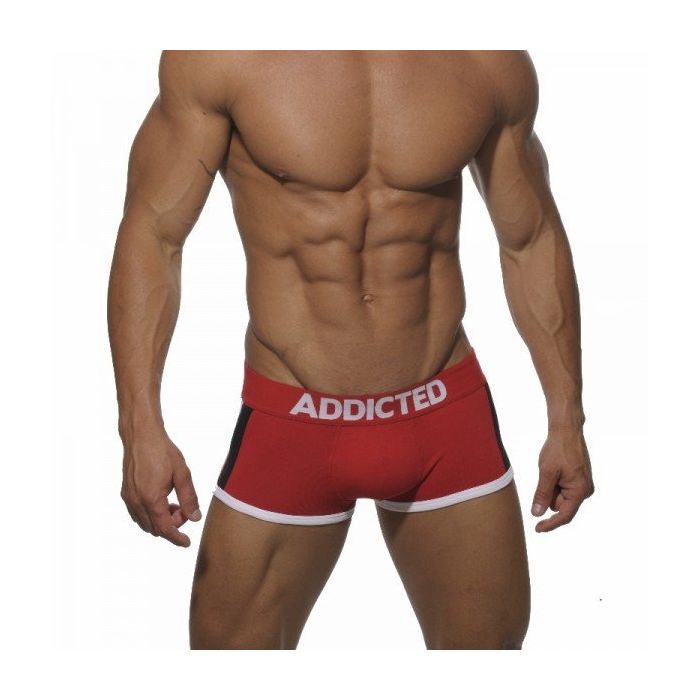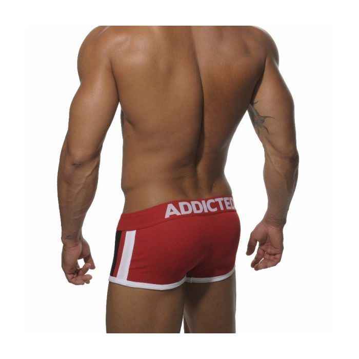 De AD158 Pack Up Boxer van Addicted zorgt ervoor dat jij een zichtbaar welgevormde voorkant zult krijgen. Dat komt doordat Addicted daar hun bekende 'pack-up' systeem in heeft aangebracht. Het pack-up systeem is een uitneembare foam cup die je aan de voorkant in een pouch kunt doen. Hierdoor zit het niet alleen voller uit, maar ook symmetrischer. Verder is de AD158 Pack Up boxershort een low-cut basic square model die zeer populair is. Door het gebruikte materiaal is hij zeer comfortabel om te dragen. Deze AD158 Pack Up Boxer van Addicted heeft als hoofdkleur Rood met witte zomen rondom de benen die aan de zijkanten doorlopen tot aan de tailleband. Tevens zijn er nog extra strepen aan de zijkanten aangebracht in zwart. Het Addicted logo vind je zowel aan de voorkant als aan de achterkant op de tailleband. Verdere verkrijgbare kleuren zijn Navy Blauw, Zwart en Wit.