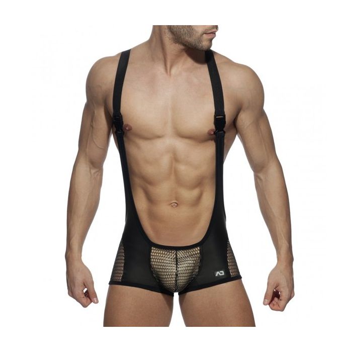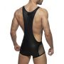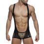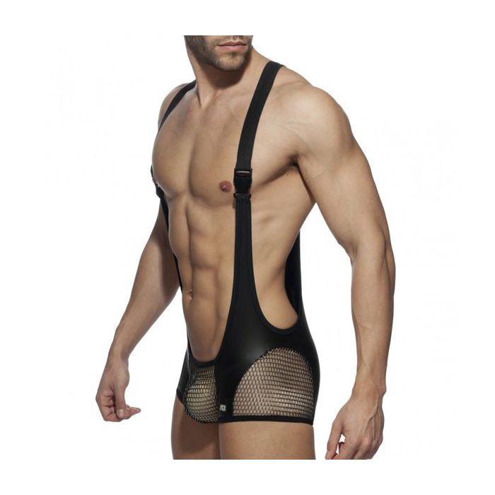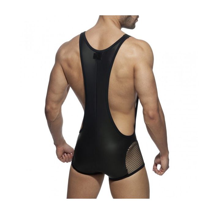 De Party Singlet van Addicted is gemaakt van zwart stretch materiaal met een spannende leder look. De buidel en delen op de dijen zijn gemaakt van 3D glitter mesh met een grof gaten structuur. Het luchtige mesh houdt niets verborgen.
