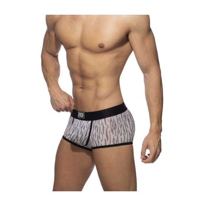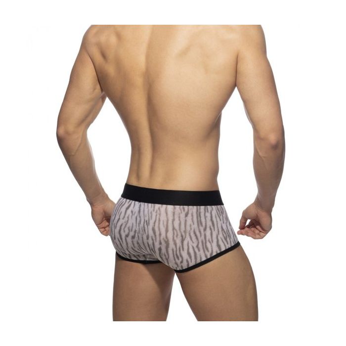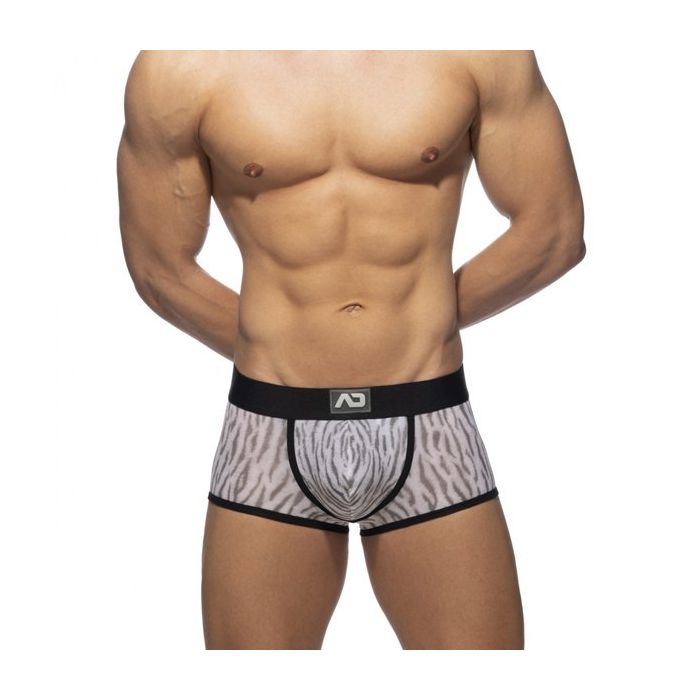 De Addicted Tiger Print Trunk - Grijs zit door de stof samenstelling als een tweede huid. Deze boxershort heeft een hoog draagcomfort en perfecte pasvorm. De zachte grijze stof heeft een speelse tijger print. De zwarte elastische tailleband en de zwarte zomen steken hier stijlvol bij af.