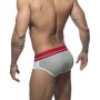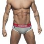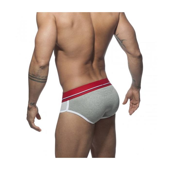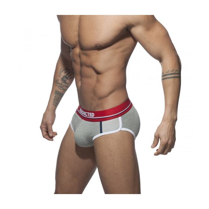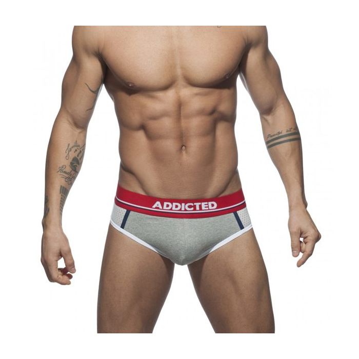 De XXL Sportive Brief - Heather Grey van Addicted is een strakke grijs gemêleerde slip met een stijlvol seventies design. De slip heeft een rode rekbare tailleband die laag rond de heupen is gepositioneerd. De zijkanten zijn afgewerkt met luchtig grijs mesh en donkerblauwe details. Langs de randen is de slip afgewerkt met witte zomen.