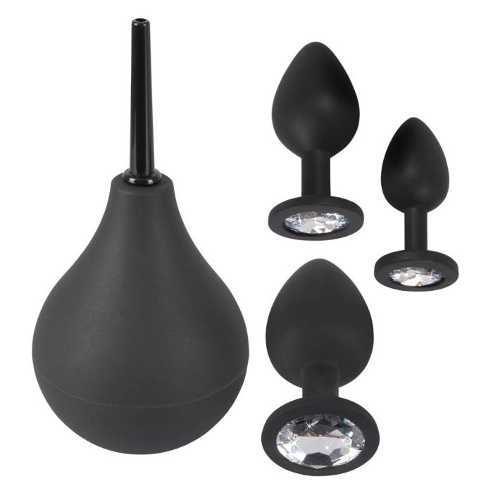 Beginnend in anaal seks? Ga dan voor deze unieke Anaal Kit met Anaaldouche van Black Velvet. Deze set bestaat uit 3 buttplugs die oplopen in lengte en in diameter en alle drie hebben ze een taps toelopende vorm zodat ze makkelijk naar binnen glijden. Daarnaast is de kit voorzien van een anaaldouche zodat jij je avontuur fris en schoon kan beginnen. De buttplugs zijn aan de onderkant voorzien van een mooie fonkelende steen voor een luxe look. Ga dus voor de Anaal Kit met Anaaldouche - Zwart wanneer jij wil beginnen met een anaal avontuur.