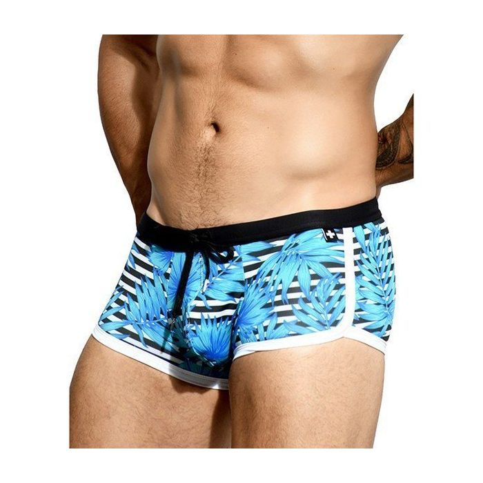 De Andrew Christian - Miami Trunk - Blauw is een geweldige zwemshort met een unieke Limited Edition print. Deze print combineert klassieke zwart-witte strepen met opvallende blauwe, tropische bladeren, waardoor je zeker opvalt op het strand of bij het zwembad. Of je nu gaat zwemmen, zonnebaden of gewoon ontspannen, deze zwembroek is de perfecte keuze. De Miami Trunk - Blauw heeft een lage elastische tailleband met een handige rijgveter, waardoor je de pasvorm kunt aanpassen aan jouw wensen. De zwembroek heeft een strakke pasvorm en een hang free model pouch, wat zorgt voor een comfortabele en vrije beweging. Daarnaast zijn de randen van de zwembroek afgewerkt met witte elastische zomen, wat zorgt voor een sportief contrast. Met deze zwemshort ben je niet alleen stijlvol, maar ook comfortabel en klaar voor een dag vol plezier in het water.