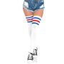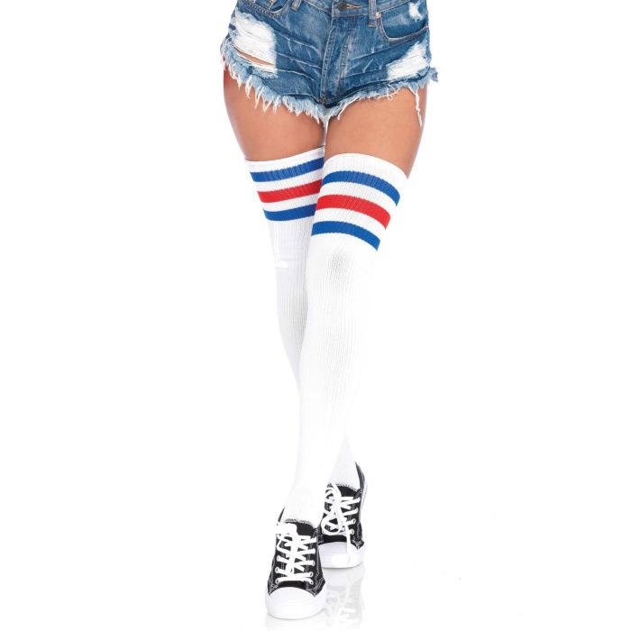 Je krijgt direct volop energie als je deze atletische witte kousen met rode en blauwe strepen van Leg Avenue draagt. De comfortabele witte kousen bedekken bijna je hele benen zodat hier extra nadruk op wordt gelegd. De blauwe en rode strepen passen perfect bij het sportthema. Draag de kousen eens bij een uitdagend kort rokje. Zo lijk je wel een echte cheerleader. Met deze kousen bewijs jij dat een sportieve look ook erg sexy kan zijn!