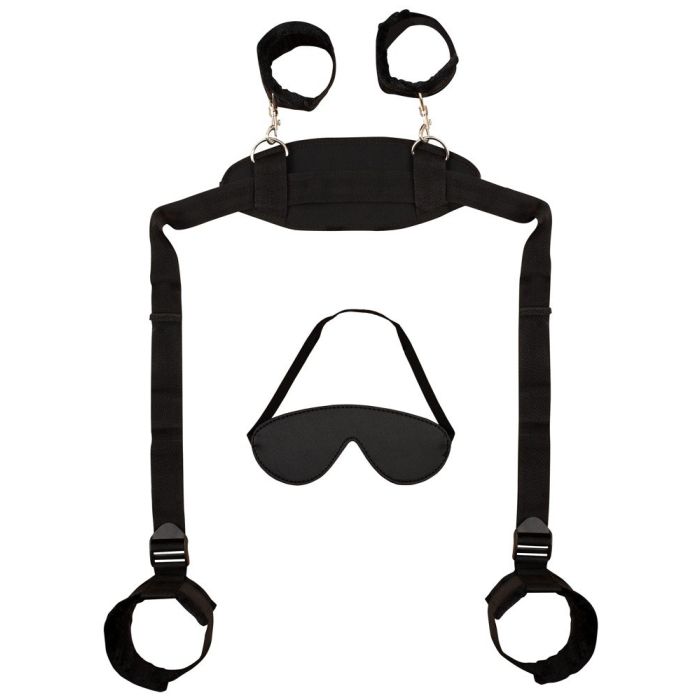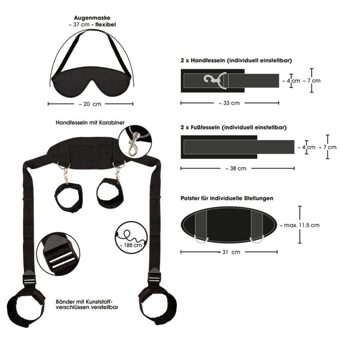 Deze BDSM Set Nek Hand Voet Bondage van Bad Kitty is een geweldige bondage set. De boeien zijn gevoerd met zacht pluche aan de binnenkant en verstelbaar met stevige klittenbandsluitingen voor een perfecte pasvorm. De riemen aan de enkelbanden zijn verstelbaar. De handboeien zijn afneembaar doormiddel karabijnhaken. De set bestaat uit nek, hand en voetboeien en een oogmasker.