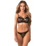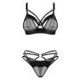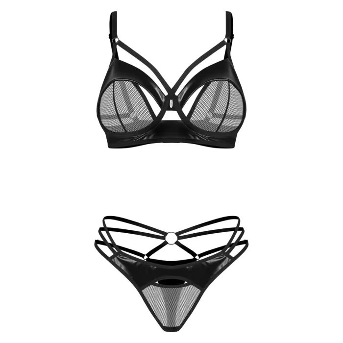 Deze set bestaat uit een beugelbeha en een bijpassende string, gemaakt van een luxe mix van zacht, fijn mesh en een trendy wetlook. De extravagante uitstraling wordt versterkt door de elastische bandjes die je figuur prachtig accentueren. Tussen de beugelcups bevindt zich een klein, verfijnd sieradenelement dat een extra vleugje glamour toevoegt aan dit onweerstaanbare ensemble.