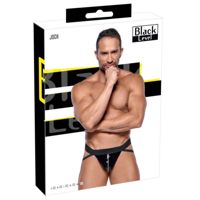 Deze zwarte vinyl jock van Black Level is een must-have voor liefhebbers van uitdagende lingerie. De jock heeft een brede, comfortabele geweven tailleband en comfortabele geweven rubberen bandjes die zorgen voor een perfecte pasvorm. De vinyl pouch is voorzien van een opvallende zilverkleurige rits, waardoor de jock niet alleen functioneel is, maar ook een stoere uitstraling heeft.
