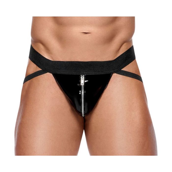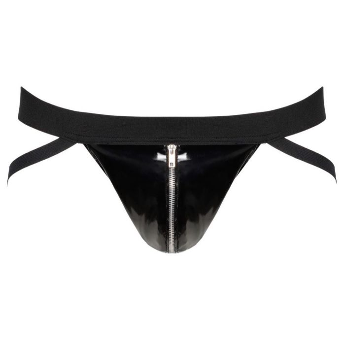 De jock is gemaakt van hoogwaardig vinyl materiaal dat zacht aanvoelt op de huid en tegelijkertijd zorgt voor een verleidelijke glans. De geweven tailleband en rubberen bandjes zorgen ervoor dat de jock comfortabel gedragen kan worden, zelfs tijdens langere periodes. De pouch met zilverkleurige rits is niet alleen handig voor het opbergen van persoonlijke spullen, maar voegt ook een speels element toe aan het ontwerp.
