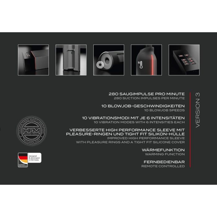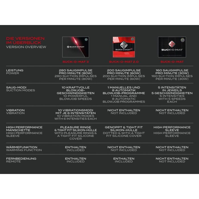 De stille, krachtige technologie van de Suck-O-Mat 3 is verpakt in een stijlvol ontwerp, met een discrete rode LED-strip die synchroon pulseert met de acties van het apparaat. Met een maximale snelheid van 280 RPM biedt de geoptimaliseerde motor een ongeëvenaarde kracht en betrouwbaarheid, waardoor de gebruiker verzekerd is van een continue en plezierige ervaring. Het apparaat wordt gevoed door een AC voedingsadapter (230V Euro Plug, output 12V, 12.5A, 150.OW), wat bijdraagt aan de krachtige prestaties. De Suck-O-Mat 3 wordt geleverd met een maat L sleeve, terwijl de maten M en XL apart verkrijgbaar zijn, zodat elke gebruiker de perfecte pasvorm kan vinden voor een optimale ervaring.