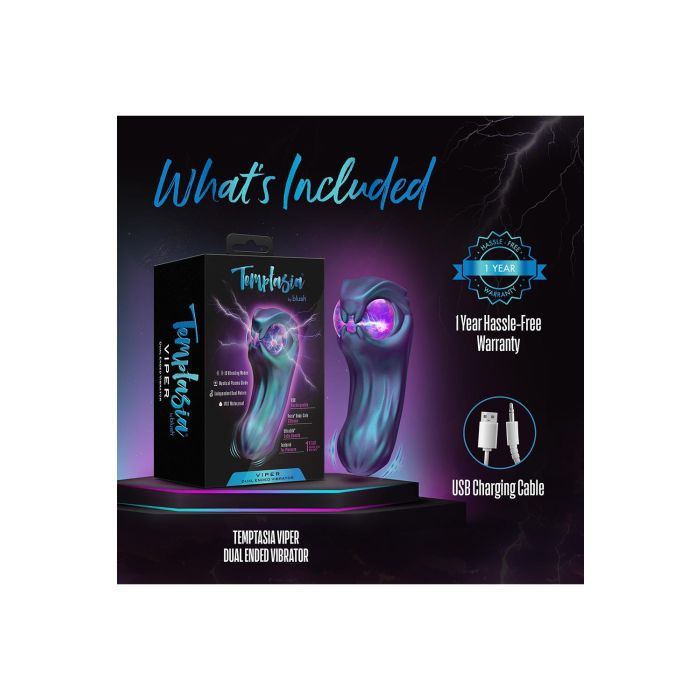 De Blush Dubbele Stimulator Viper Vibrator met zijn mystieke plasmabol die pulserend leven in je verlangens blaast. Deze unieke vibrator is ontworpen om je zintuigen te prikkelen met maar liefst 10 verschillende vibratiestanden, waaronder 3 snelheden en 7 opwindende patronen. Of je nu op zoek bent naar een subtiele aanraking of een krachtige stimulatie, de Viper past zich aan jouw wensen aan. Het innovatieve ontwerp met twee uiteinden biedt een ongeëvenaarde ervaring, waarbij elke kant zorgvuldig is gevormd om zowel inwendig als uitwendig genot te maximaliseren. Laat je meevoeren door de rondingen en ribbels die elke aanraking intensifiëren, terwijl de luxueuze UltraSilk® siliconen zachtjes over je huid glijden.