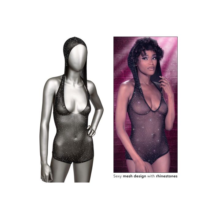 Met prachtige strassteentjes die glamour en sprankeling toevoegen, kan je deze body suit stijlen met of zonder capuchon voor veelzijdigheid.