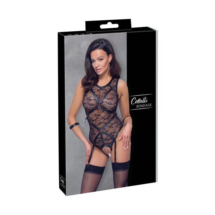 De Bondage Body van Kant komt uit de Bondage lijn van Cottelli Collection. De body is gemaakt van weelderig bloemen kant met stretch kwaliteit voor een perfecte pasvorm. Over de body lopen wetlook riemen met metalen ringen en ook de randen van het kant zijn met wetlook materiaal afgewerkt.