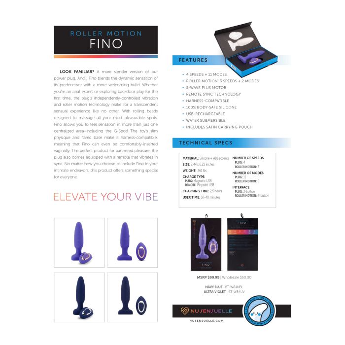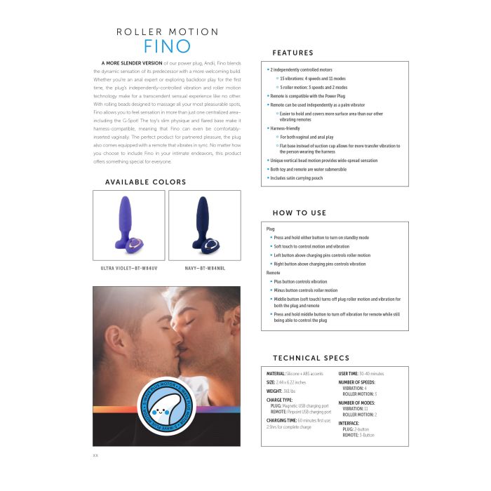 Het slanke lichaam en de uitlopende basis van het speeltje maken het geschikt voor harnasgebruik, wat betekent dat Fino zelfs comfortabel vaginaal kan worden ingebracht. Het perfecte product voor gedeeld plezier, de plug wordt ook geleverd met een afstandsbediening die synchroon vibreert. Ongeacht hoe je ervoor kiest om Fino op te nemen in je intieme activiteiten, biedt dit product iets speciaals voor iedereen.