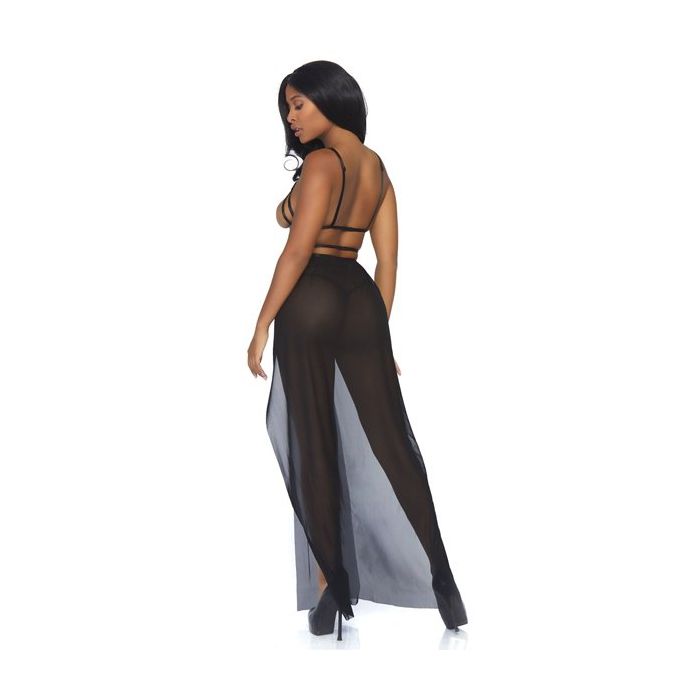 Vanaf het lijfje van de Cage Bodice Maxi Dress valt doorschijnende stof soepel naar beneden en aan de voorkant zijn 2 splitten gevormd voor extra elegantie. Bij de lange jruk wordt een string geleverd.