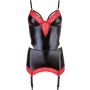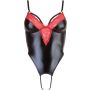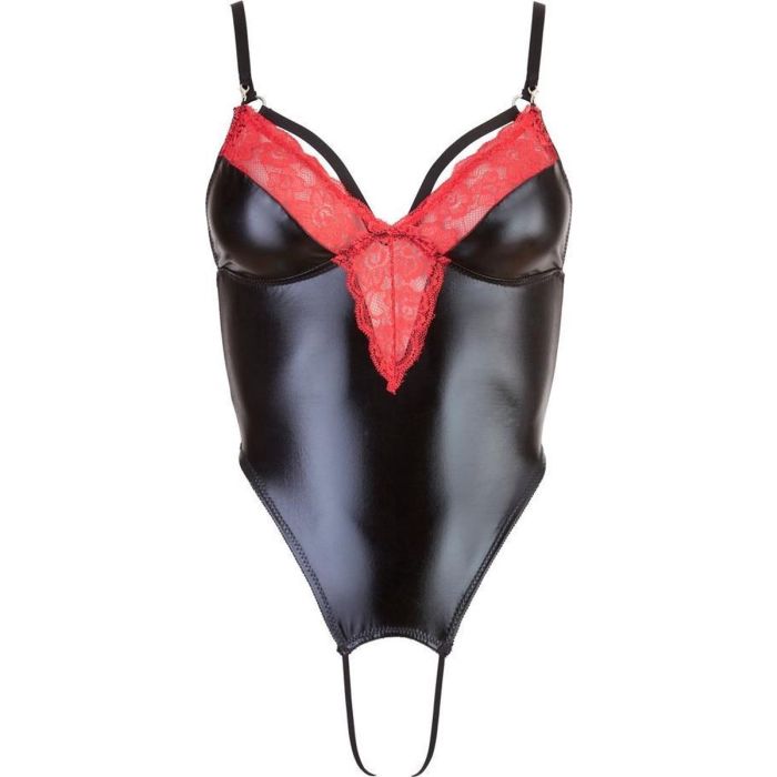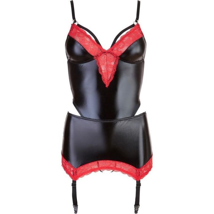 Een jurkje, rokje, topje en body allemaal in 1! Jij kan alle kanten op met dit schitterende setje. Draag de body met of zonder open cups. Draag het met of zonder rokje, Draag alleen het rokje draag een broek op de body, draag het samen. Kortom jij hoeft je geen moment te vervelen met deze gewelidge set kleding. De set is gemaakt van wetlook materiaal en is afgezet met prachtig rood kant. De body heeft verwijderbare cups zodat jij ook je borsten kan showen als je dat wilt. Aan het rokje zitten jarretels die jij aan je kousen kan vast zetten. Alles is verstelbaar voor een perfecte pasvorm. Verras je partner of show jezelf in de club, hoe dan ook! Iedereen die jou ziet in deze outfit zal zich verrukt omdraaien naar jou.