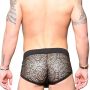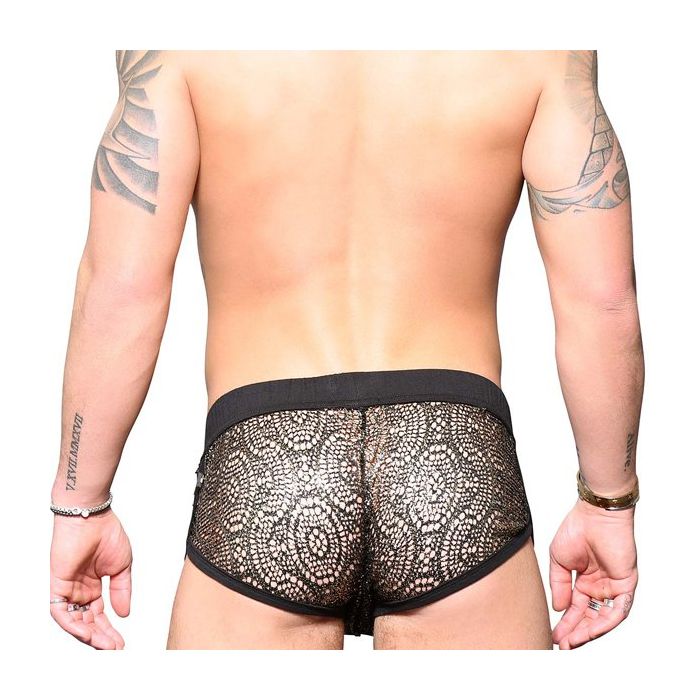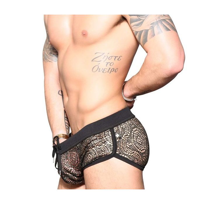 De Andrew Christian El Dorado Short is een sportieve en tegelijk chique short. De jogger short heeft een brede tailleband gemaakt van zacht katoen met rijgveter. Ook de zomen zijn gemaakt van zacht katoen voor een hoog draagcomfort. Het mesh met sierlijk gaten patroon is doorzichtig en er zijn goudkleurige vlokjes op aangebracht voor een sprankelend effect.