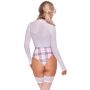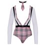 De extra laag uitgesneden bodysuit heeft aangehechte stretchbanden aan de voorzijde in bretellook, wat zorgt voor een extra sexy touch. Daarnaast is er een aangehechte ceintuur aan de voorzijde met een mooie sluiting, evenals een halsband met een klein geruit bandje en gesp aan de hals voor een complete en ondeugende look.
