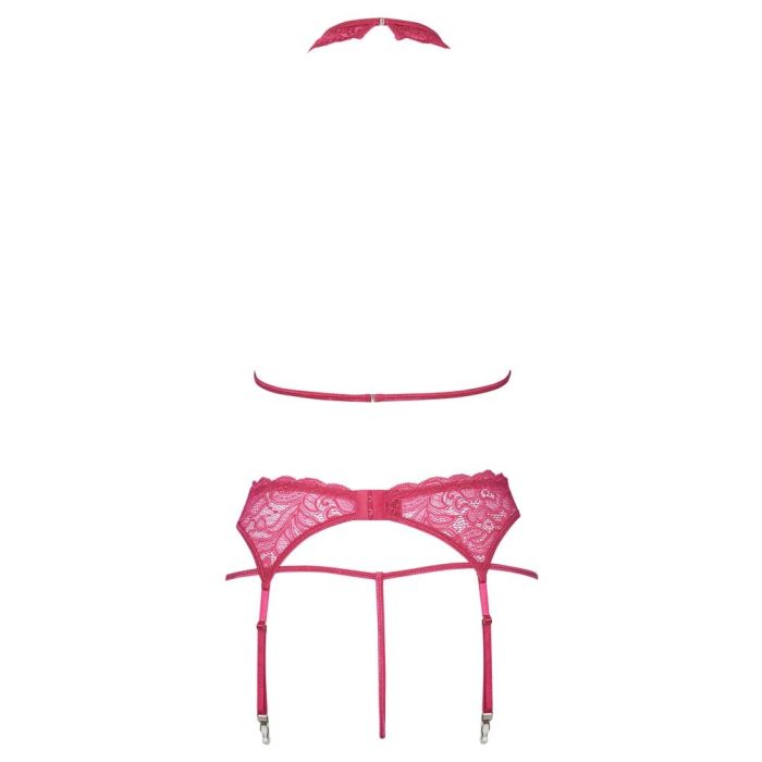De beha heeft een zachte halternek en een haakjessluiting, waardoor deze gemakkelijk aan te passen is aan jouw maat en voorkeur. De jarretelgordel heeft een haaksluiting aan de achterkant en verstelbare jarretels, zodat je de perfecte pasvorm kunt creëren.