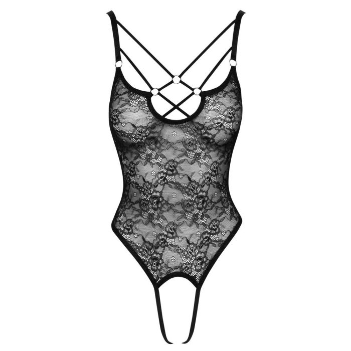 Cottelli Kanten Stringbody Gebloemd Open Kruis - Zwart