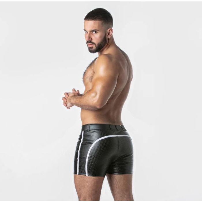 Deze mini short, vervaardigd uit het meest verfijnde perforated leatherette, biedt een unieke combinatie van stijl en functionaliteit. Het gebruik van contrastbinding accentueert de aantrekkelijke lijnen van het ontwerp, waardoor het een opvallende keuze is voor modebewuste individuen. Het populaire merk Locker Gear staat bekend om zijn gedurfde en trendy kleding, en deze short vormt daarop geen uitzondering.