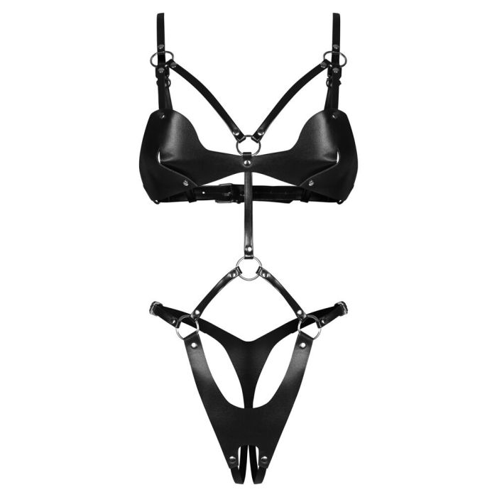 Dit gedurfde pak uit één stuk is perfect voor de zelfverzekerde vrouw die haar sexy kant wil laten zien. De zwarte body in harnasstijl is gemaakt van zacht imitatieleer, wat zorgt voor een luxe uitstraling en een comfortabele pasvorm. De verfijnde banddetails en de zilverkleurige klinknagels geven het geheel een edgy touch.