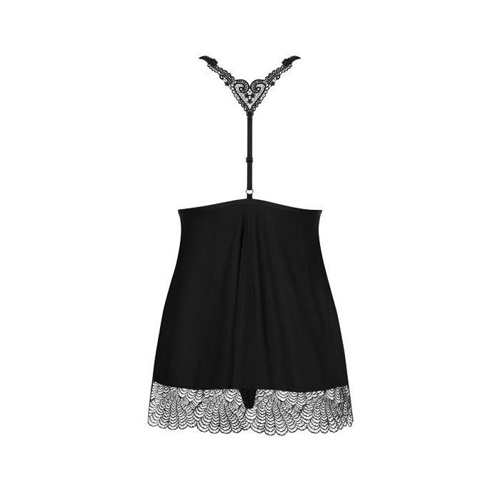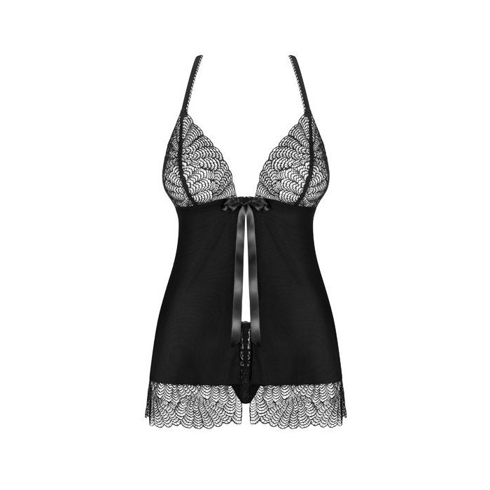 De babydoll heeft doorzichtige cups van bijzonder mooi kant. Tussen de cups kan de babydoll dicht gestrikt worden met lintjes. Hierdoor ontstaat een spannende split. De zachte zwarte stof valt sierlijk tot op jouw heupen. Aan de achterkant is een geborduurd detail aangebracht waar de schouderbandjes samen komen. Het borduursel geeft een adembenemend mooi effect.