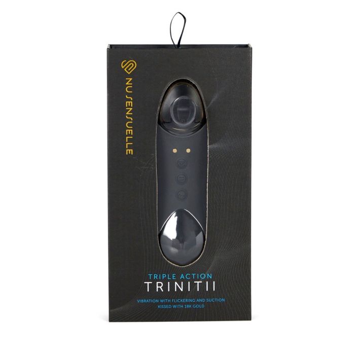Deze Clitoris Stimulator Trinitii 3in1 Tongue 18K Gold van Nu Sensuelle zorgt voor heerlijke clitoris stimulatie. Trinitii doet zijn naam eer aan en combineert drie afzonderlijke sensaties om ongelooflijk unieke en krachtige clitorale stimulatie te geven. Plaats Trinitii met zijn zachte opening over de clitoris om zachte zuigkracht te ervaren. Stand 2 is de flikkerende tong die het gevoel van orale seks nabootst. De derde vibreert om je tot een ongekende hoogtepunt te brengen. De clitoris stimulator heeft 15 vibratiepatronen, 7 zuigintensiteiten en 4 snelheden van flikkerende tongbewegingen. Trinitii is volledig oplaadbaar met de meeleverde oplaadkabel.
