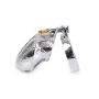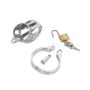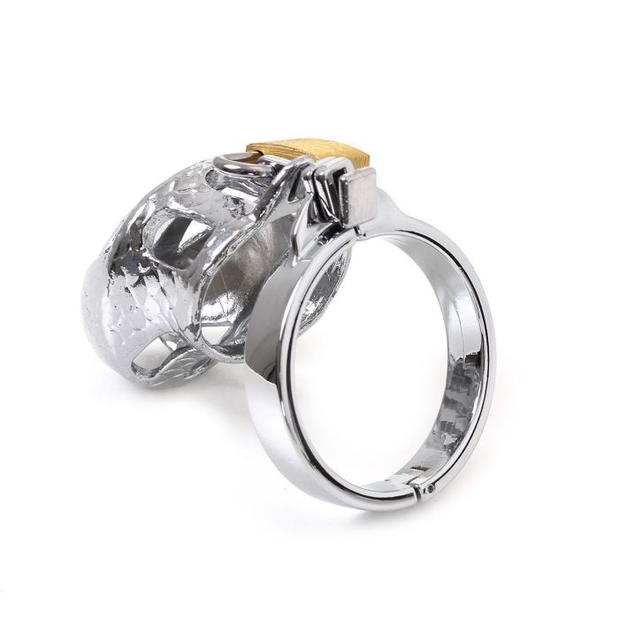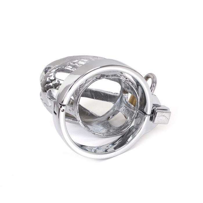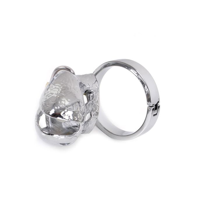 Heeft jouw stoute slaaf teveel vrijheid? Houdt je slaaf dan achter slot en grendel met deze échte metalen kuisheidskooi. Sluit je slaafje op en dwing hem zich over te geven door de kooi en de ring over de penisschacht te plaatsen zodat hij geen kant op kan. Wanneer dit is gebeurd, begint het spel pas echt. Met zijn mannelijkheid opgesloten in een fort van metaal, zal hij geen volledige erectie kunnen krijgen. Dat betekent dat zijn bevrediging en stimulatie beperkt zijn gedurende de tijd dat je hem beperkt houdt. Lang leve dominantie! De ring is 45 mm en de ingang is 32 mm voor de penis.