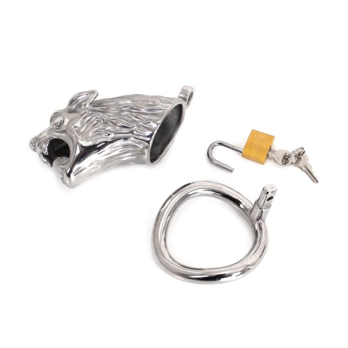 Heeft jouw partner of sub iets te veel vrijheid? Beperk deze dan met de Kiotos Cock Cage Lion. Deze peniskooi in leeuwenvorm heeft een super stoere en kinky uitstraling en is geschikt voor liefhebbers van BDSM. De Cock Cage Lion is gemaakt van hoogwaardig RVS en wordt afgesloten met een slotje. Dit maakt het onmogelijk om er nog uit te komen, tenzij de master hem zijn vrijheid biedt. Deze leeuwenvorm peniskooi is zeer gemakkelijk in gebruik; plaat de kooi en de ring over zijn schacht en sluit af met het slotje. De ring heeft een diameter van 45 mm. Het is nu voor hem onmogelijk om een erectie te krijgen. Wil je hem nog verder kwellen? Dan begint het spel der verleiding en opwinding..