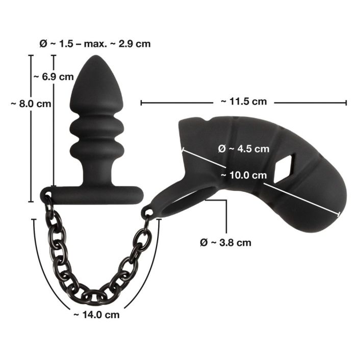 De CockCage met Buttplug van Black Velvets is een peniskooi met een testikelring en verbindt deze via een robuuste ketting met de uitgesproken geribbelde anaalplug. Naast het geweldige gevoel van het dragen, ziet het er ook nog eens opwindend uit.