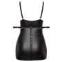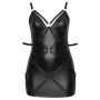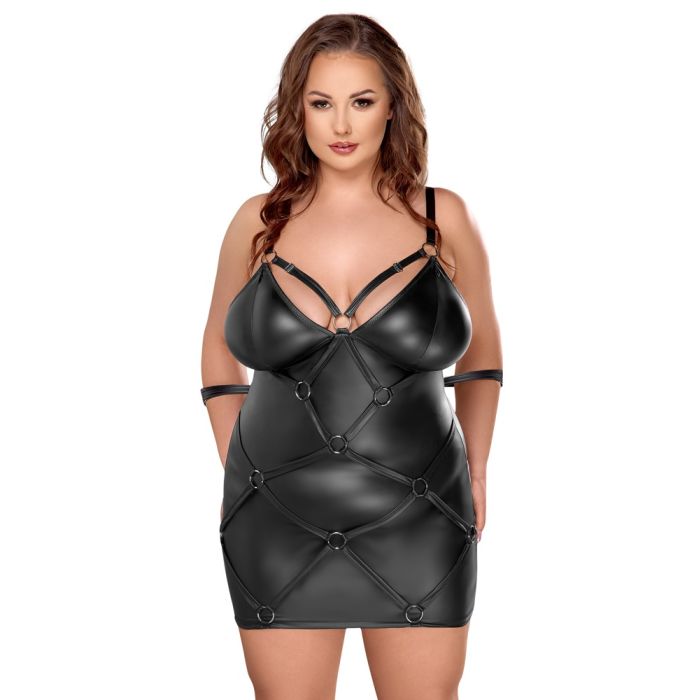De Cottelli Curves Bondage Jurk - Zwart is een mat zwart, leder look jurkje. Het jurkje is gemaakt van gladde stof met stretch kwaliteit voor een nauwsluitende pasvorm en hoog draagcomfort. Het jurkje is kort en heeft lange mouwen en een hoge kraag en metalen ringen voor een extra kinky look. Combineer de Cottelli Curves Bondage Jurk - Zwart met een paar hoge hakken voor een geweldige look.