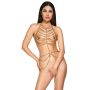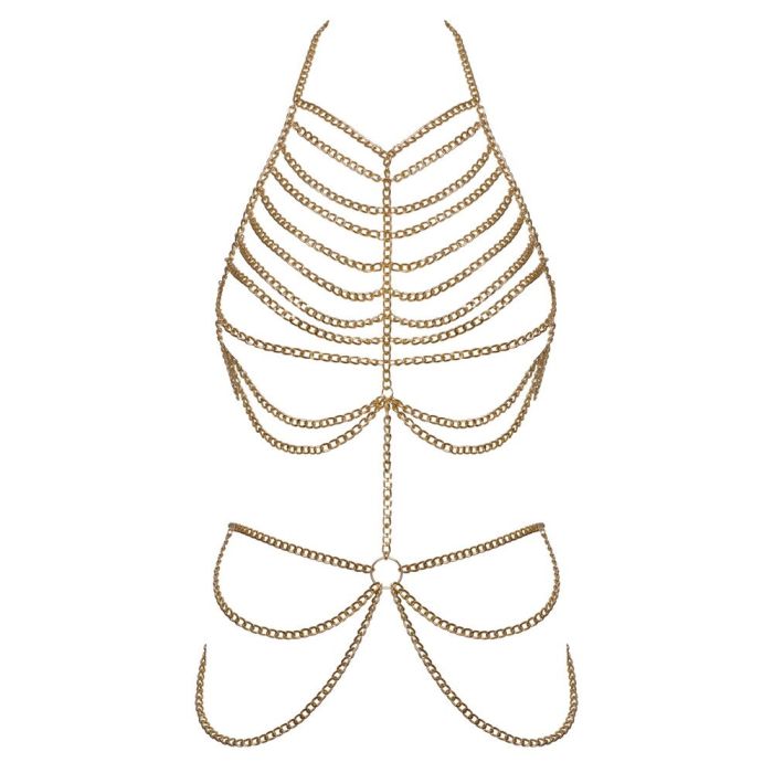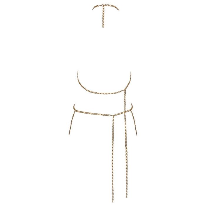 Deze prachtige goudkleurige lichaamsketting van Cottelli is een echte must-have voor elke modebewuste vrouw die haar sensualiteit wil benadrukken. Het ontwerp is tweedelig en biedt een unieke uitstraling die zowel elegant als verleidelijk is. De weelderige kettingversiering die over de borsten en heupen valt, accentueert de vrouwelijke vormen op een subtiele maar krachtige manier. Of je nu een speciale gelegenheid hebt of gewoon jezelf wilt verwennen, deze lichaamsketting voegt een vleugje glamour toe aan elke outfit.