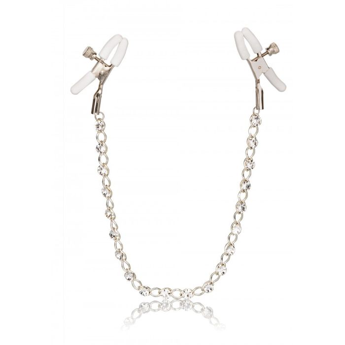 Breng je bdsm sessie naar een hoger level met deze schitterende Crystal Chain tepelklemmen. De tepelklemmen zijn met elkaar verbonden met een mooie ketting met sprankelende kristallen. De tepelklemmen zijn verstelbaar met een draaisysteem en de klemmen hebben een siliconen top zodat de klemmen niet snel af zullen glijden en de huid zullen sparen. Geniet van pijn en plezier met de Crystal Chain Nipple Clamps en ga een hete nacht tegemoed.