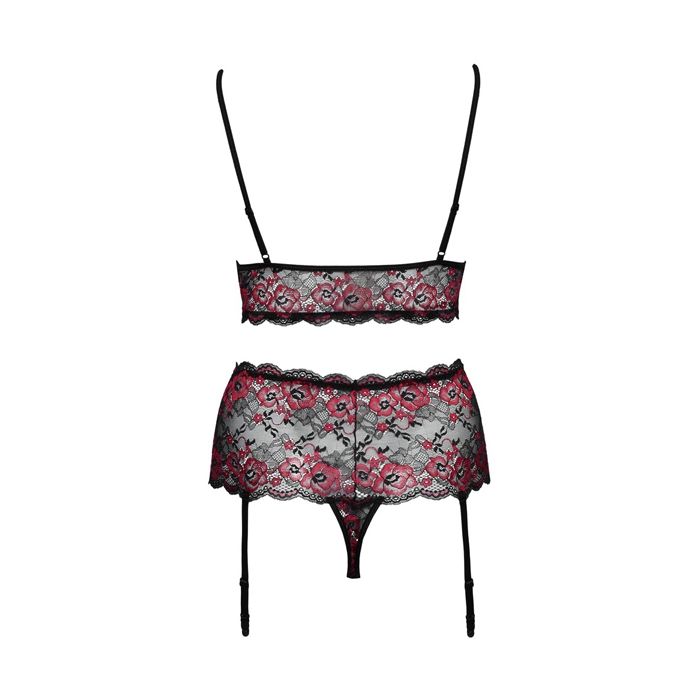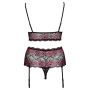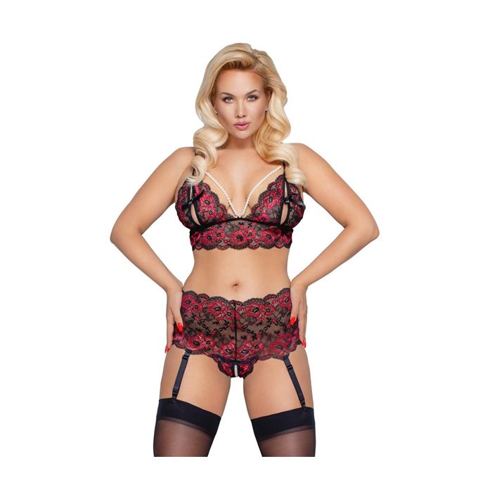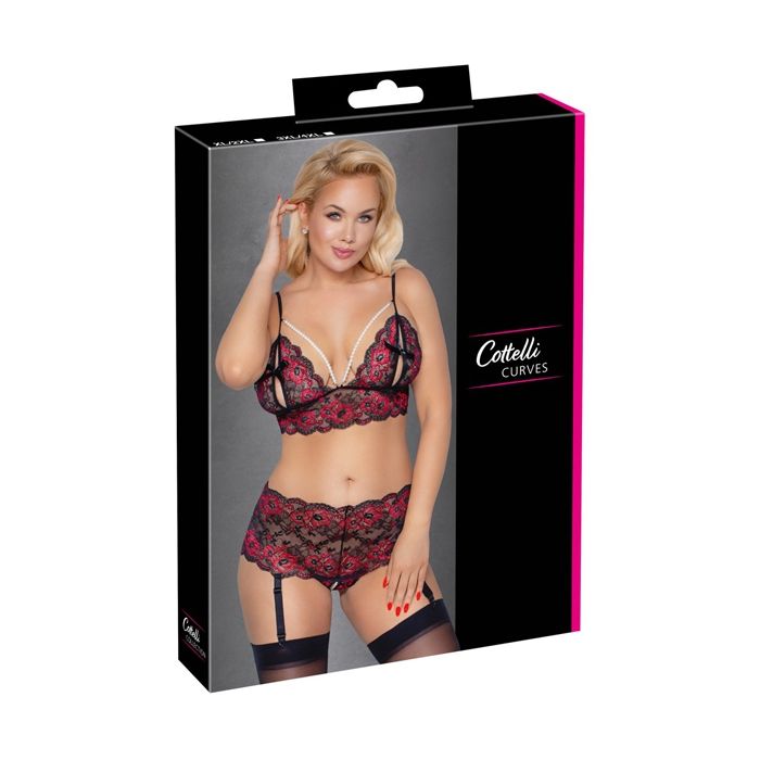 De luxe Curves Floral Lace Jarretel Set komt uit de plus size serie van Cottelli Collection. De tweedelige set bestaat uit een kanten bralette bh en een kanten string met afneembare jarretelbandjes.