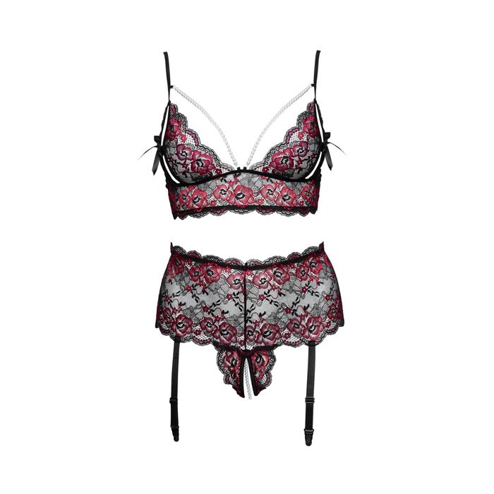 De bh en string zijn beiden gemaakt van tweekleurig kant dat heerlijk zacht aanvoelt en is voorzien van stretch. De bralette bh heeft ongevoerde cups, zonder beugels en verstelbare schouderbandjes. In de cups zijn openingen gemaakt met strikjes. Over het decolleté zijn parelkettingen gespannen. De string heeft een brede bandeau band en een verwelkomend open kruisje. In het open kruis loopt een parelketting die kan worden ingezet als stimulerend middel.