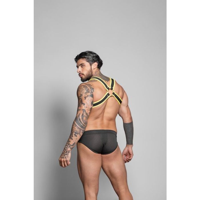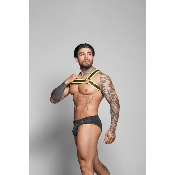 Dit harnas is de perfecte aanvulling voor elke man die zijn gespierde figuur wil accentueren en een krachtige uitstraling wil hebben. De Dale Mas Biker Harnas in zwart en geel is ontworpen om jouw bovenlichaam een extra brede en gespierde look te geven. De combinatie van de stoere kleuren zorgt ervoor dat je niet alleen sexy, maar ook mysterieus overkomt. Of je nu naar een feestje gaat of gewoon een avondje uit, dit harnas zal zeker de aandacht trekken en je zelfvertrouwen een boost geven.