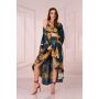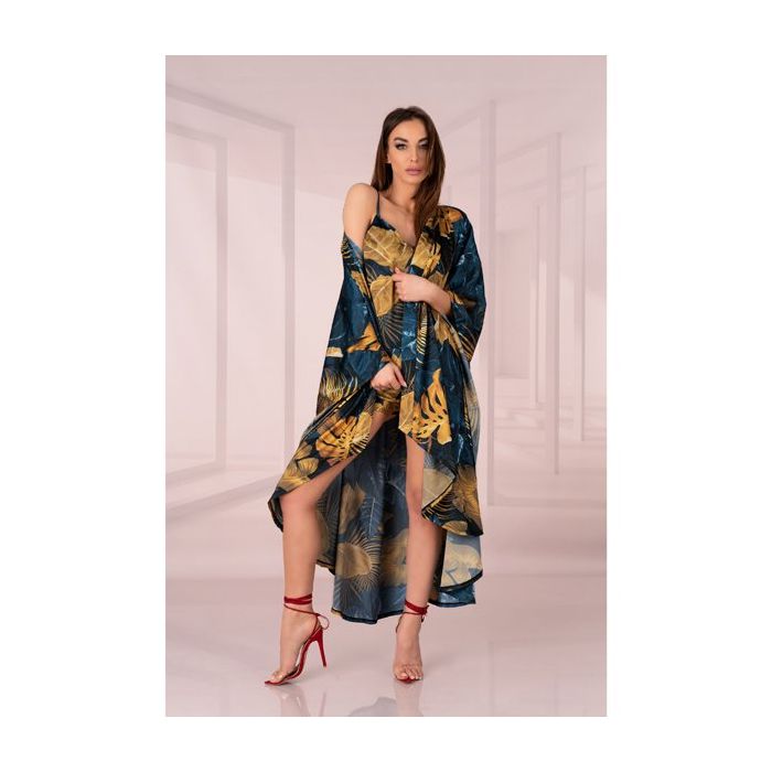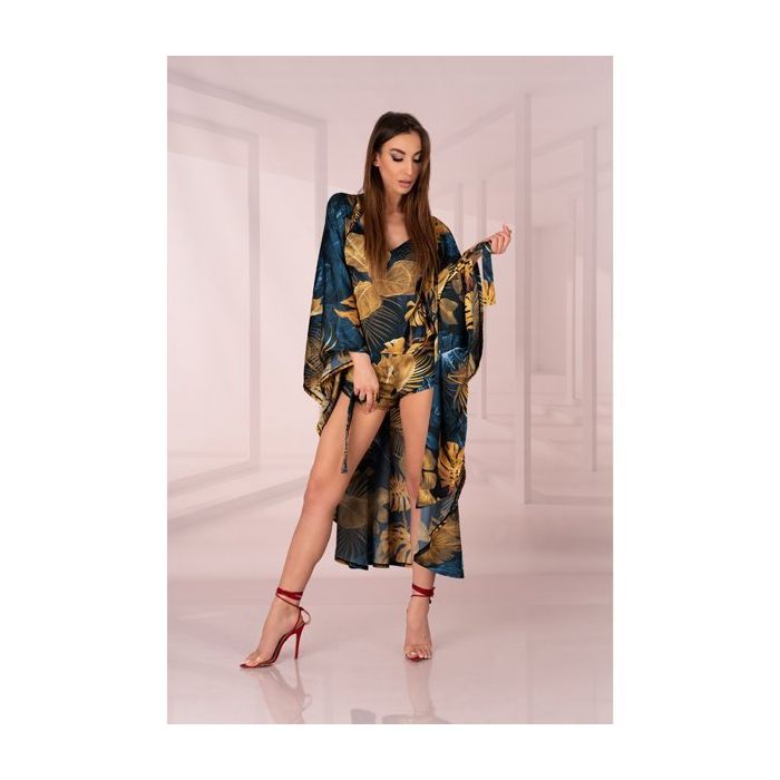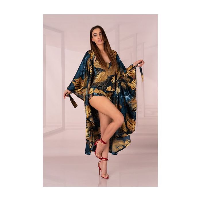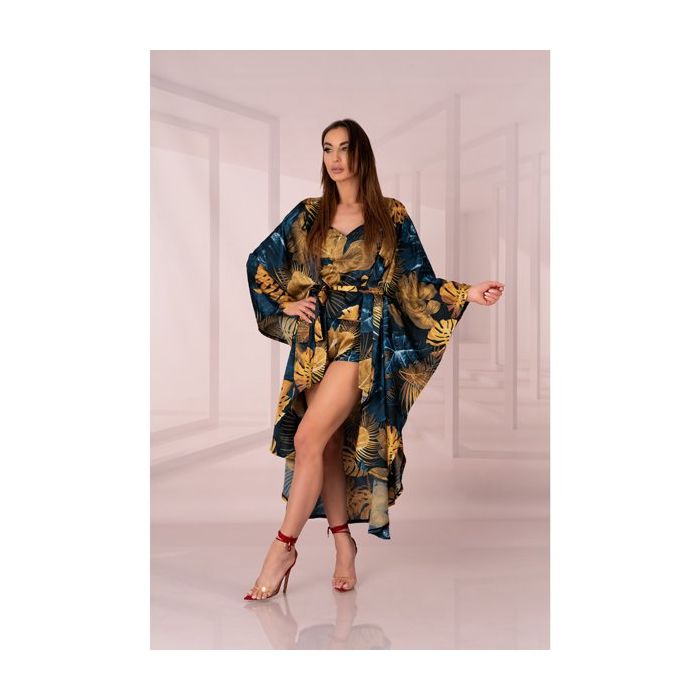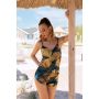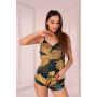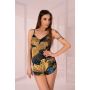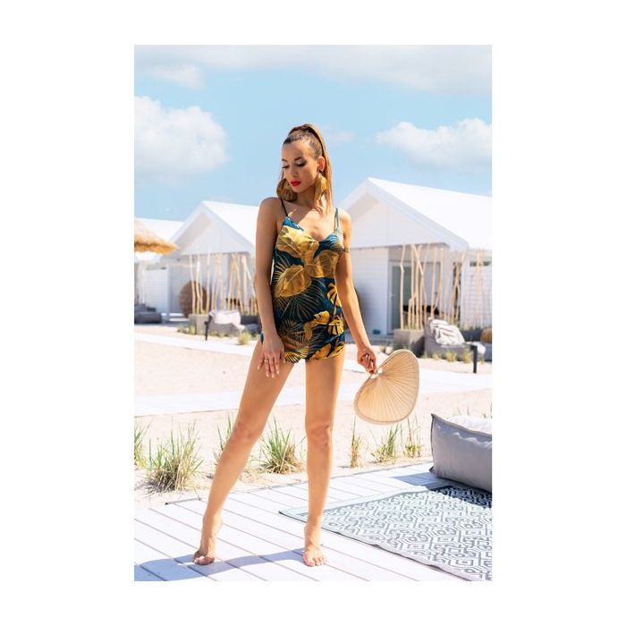 De top heeft een sierlijke V-hals en verstelbare schouderbandjes. De korte short is aan de zijkanten afgerond en is voorzien van elastiek in de tailleband. De tropische print met blauwe en gele bladeren geeft een zomerse sfeer.