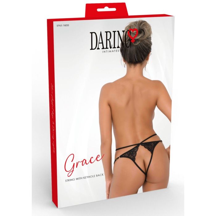 Maak een verbluffende indruk met de Daring Grace String met Keyhole Rug - Zwart. Dit sexy kanten stringetje is ontworpen om te betoveren en te verleiden. Met zijn gedetailleerde bloemenkant aan de voorkant en verstelbare bandjes straalt het een onweerstaanbare charme uit. Het sleutelgat aan de achterkant voegt een vleugje verleidelijke aantrekkingskracht toe en laat een blijvende indruk achter. Of je nu passie wilt ontsteken of wilt genieten van een moment van intieme luxe, Daring Grace String met Keyhole Rug - Zwart is de perfecte keuze.