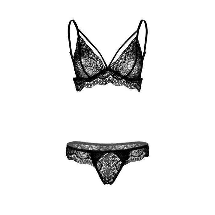 De set bestaat uit een bralette bh en een bijpassende string. De bh en de string zijn beiden gemaakt van weelderig bloemen kant met geschulpte randjes. De bralette heeft cups zonder voering en zonder beugels. Het decolleté is verrukkelijk diep en verleidelijk afgewerkt met geschulpte randen en speelse bandjes. Het kant loopt een stukje door onder de cups voor een elegant effect.