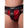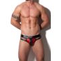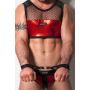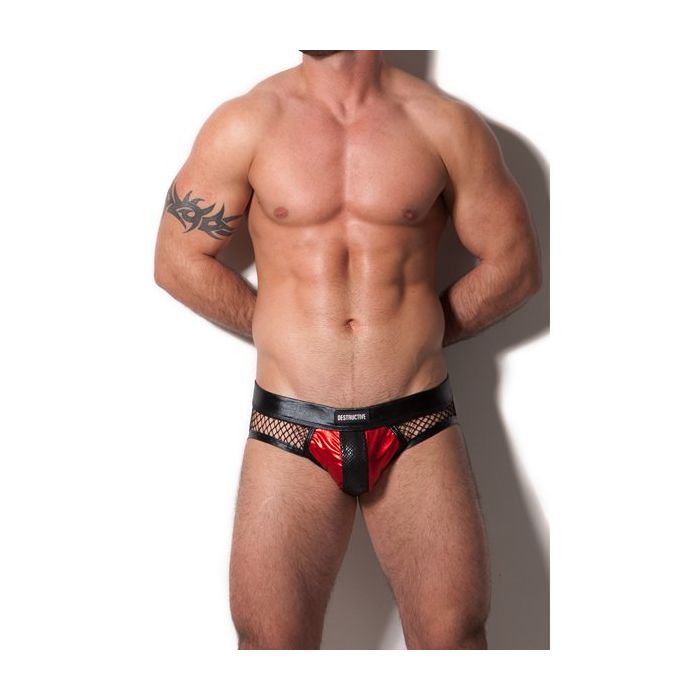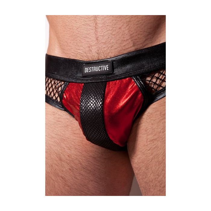 Op de elastische, kunstleren tailleband is het Destructive logo aangebracht. Rondom is de slip gemaakt van grof mesh, waarin jouw heerlijk kontje op goed te zien is. De comfortabele buidel is gemaakt van opvallend rode stof met een strook nep slangenleer over het midden. De buidel zal dan ook zeker de aandacht trekken.