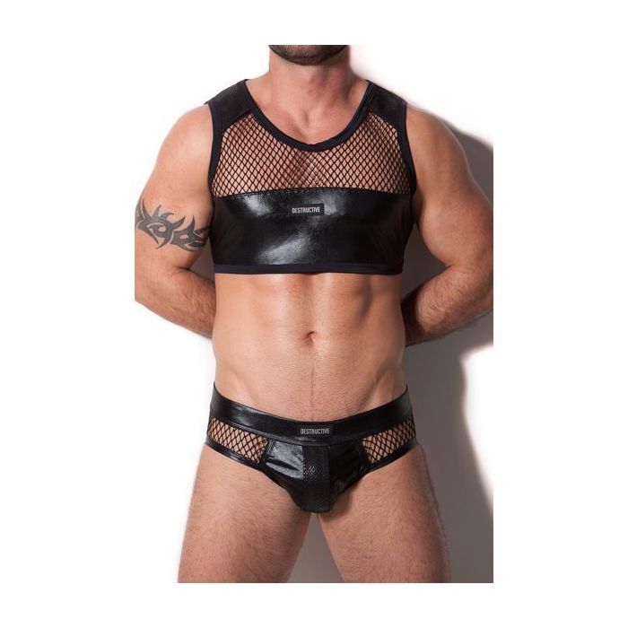 Met de Mesh Snake Leather Slip - Zwart van Destructive ga jij voor een kinky look! Deze slip is gemaakt van hoogwaardige materialen. Deze comfortabele slip heeft een lage, elastische tailleband en een strakke pasvorm.