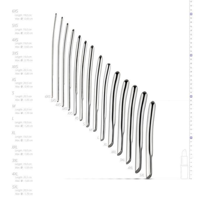 De Sinner Gear Single Ended Dilators Set bestaat uit 14 zorgvuldig ontworpen dilators. Deze set biedt een scala aan diameters, variërend van 0,4 cm tot 1,7 cm, zodat je op jouw eigen tempo kunt verkennen en genieten. Gemaakt van hoogwaardig roestvrij staal, zijn deze dilators niet alleen sterk en duurzaam, maar ook eenvoudig schoon te maken en te onderhouden. Combineer ze met je favoriete glijmiddel voor een soepele en comfortabele ervaring. Of je nu een beginner bent of al meer ervaring hebt, deze set biedt de perfecte mogelijkheid om je grenzen te verleggen en nieuwe sensaties te ontdekken.