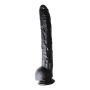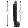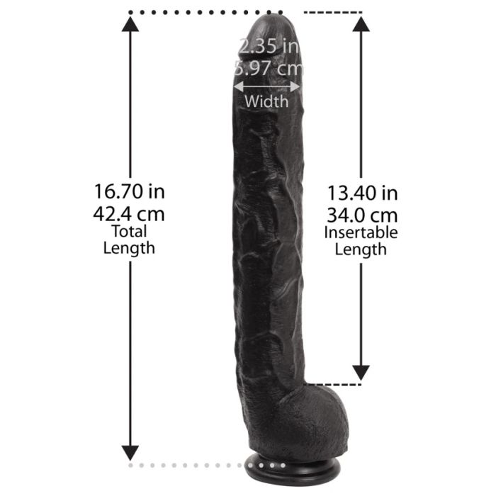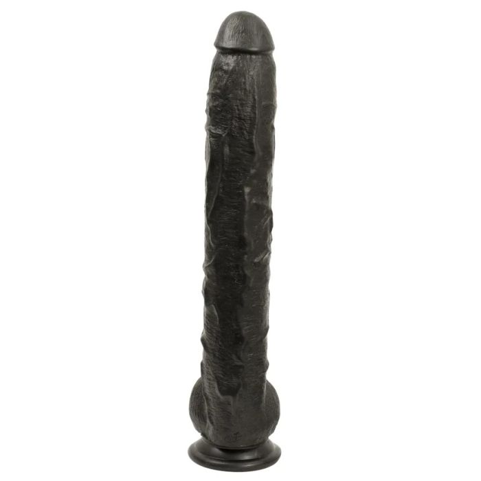Deze prachtig gereproduceerde penis is absoluut adembenemend met een totale lengte van wel 42 centimeter. Met een doorsnede van ongeveer 6 cm (omtrek ruim 19cm) en zijn balzak met een doorsnede van 10 cm laat deze Gummi Gigant niets te wensen over. Het materiaal is zacht en gentle voor wat voor penetratie dan ook. De schacht is stevig geaderd, de eikel en ballen zijn zo natuurlijk mogelijk nagebootst. De zwarte huidskleur onderstreept de natuurlijke uitstraling, net echt maar dan dubbel zo groot. Met zuignap, die kunt u op een glad oppervlak plakken, bijvoorbeeld de douche of een stoel. Gewicht: bijna 1700 gram Vergeet niet de afdeling drogist te bezoeken want genoeg glijmiddel is bij deze jongen wel nodig.