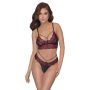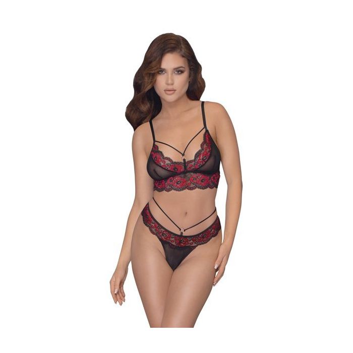 De top heeft beugelvrije cups en een uitdagend diep decolleté. Het tweekleurige kant loopt onder de cups een stukje door voor een vrouwelijk design. De schouderbandjes zijn verstelbaar. De string heeft een kanten tailleband en een speels bandje die rond de heupen loopt voor een extra sexy aanblik.