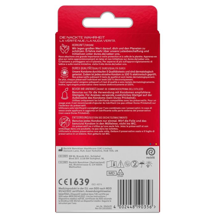 Deze dunne condooms van het merk Durex zijn gemaakt van natuurrubberlatex en behoren tot de grootste condooms op de markt. De condooms hebben een natte coating op siliconenbasis en reservoir.