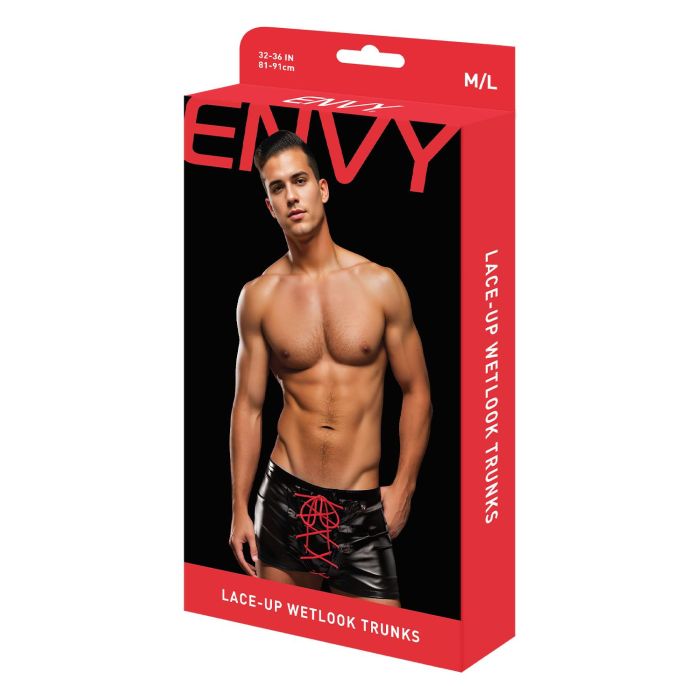 Met een perfecte mix van verfijning en sensualiteit tonen deze lace-up trunks de toewijding van Envy Menswear om innovatieve en modieuze intieme kleding te leveren voor de moderne man die zowel stijl als opwinding zoekt in zijn garderobe. De opvallende wetlook stof en de gedurfde rode veters maken deze trunks tot een echte blikvanger, waardoor ze perfect zijn voor speciale gelegenheden of gewoon voor een avond vol spanning en verleiding.